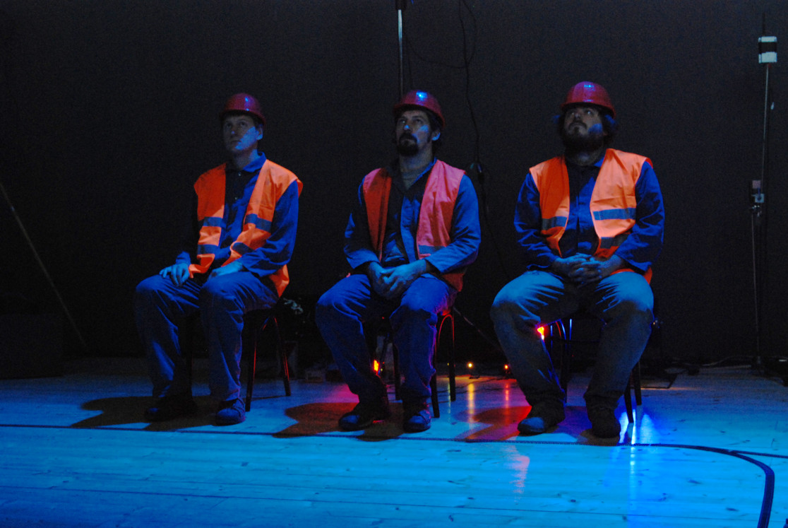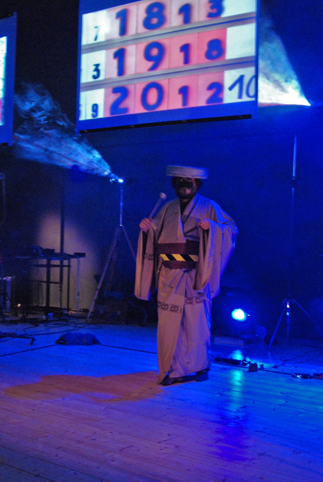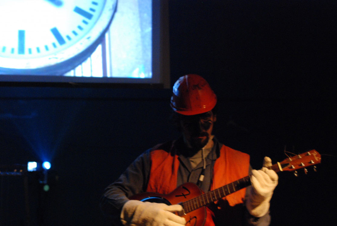 A concert for the sounds of trains, iron percussion instruments, projected photographs collected in and around train stations, with several performers standing by.
